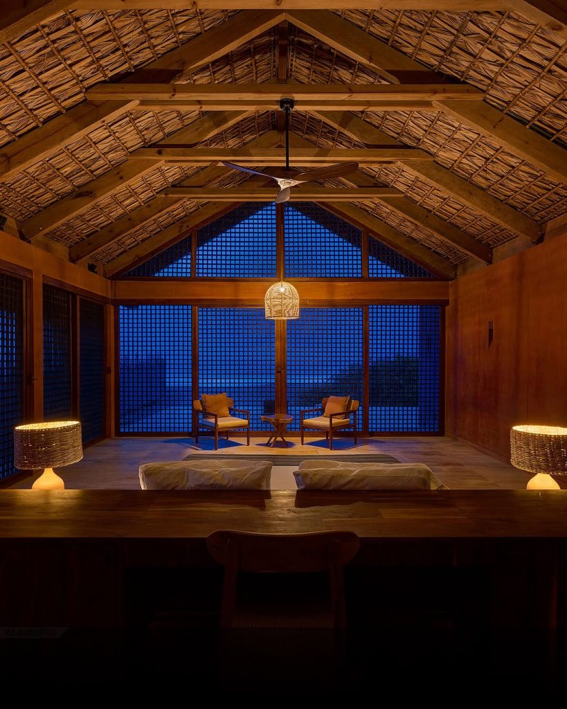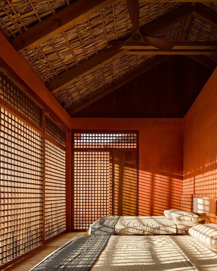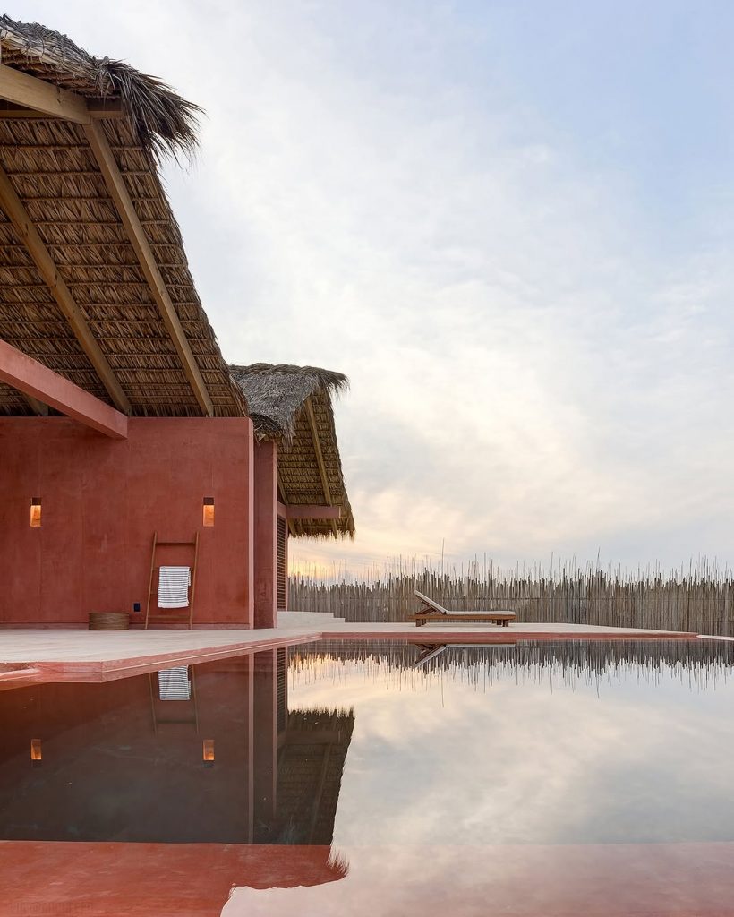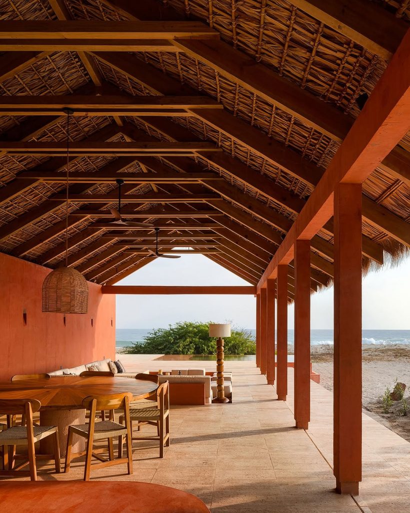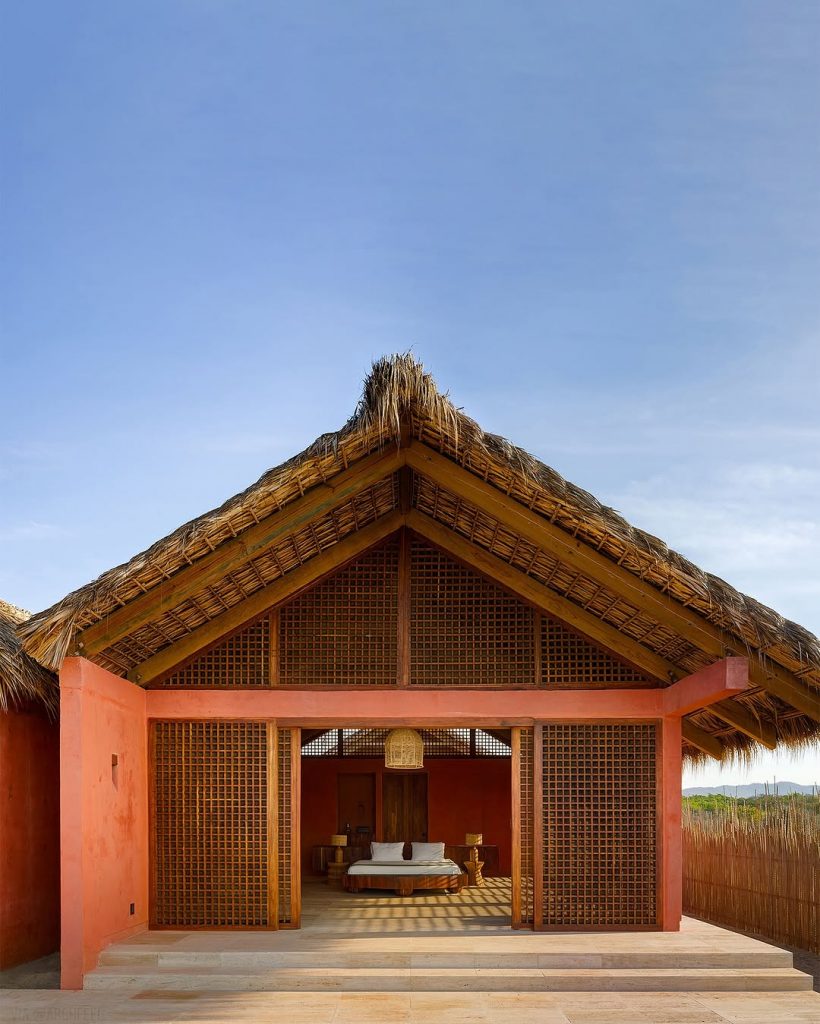 تصاویر پایین متعلق است به اقامتگاههای مدرن بین تالاب و دریا در شهر “اوآخاکا د خوارز” مکزیک. خورخه اسکوئر لوک (معمار) سقفها را از برگهای بافتهشده نخل ساخته و برای بدنه و دیوار از بتن رنگدانهدار استفاده کرده است.